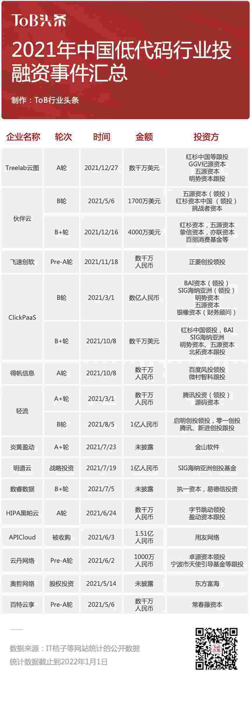 到2021年,,,,,,,,,,,,,,无/低代码投融资规模势头更甚,,,,,,,,,,,其中包括轻流两轮融资(A+轮数千万人民币,,,,,,,,,,,,B轮近亿人民币)、、、、、、、、、、、小米钱包 两轮融资(B轮数亿人民币,,,,,,,,,,B+轮数千万美元)、、、、、、、、、、、、、百特云享数千万元Pre-A轮融资......